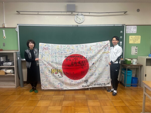 贈呈された応援メッセージ入り国旗を掲げる岩佐選手(右)とお母様(左)