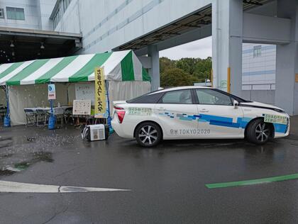 燃料電池自動車(FCV)は排気ガスや騒音が出ない、クリーンな発電装置として携帯電話の充電コーナーへ給電を行い活躍しました。