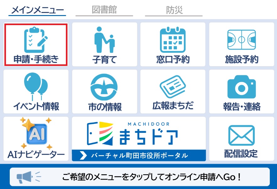 - 町田市公式LINEのトーク画面の「まちドア」から「申請・手続き」を選択してください。