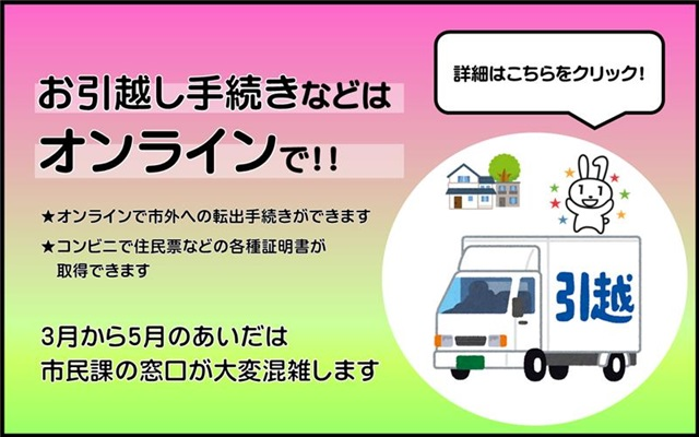 オンラインで市外への転出手続きができます。コンビニで各種証明書が取得できます。3月から5月のあいだは、市民課の窓口が大変混雑します。