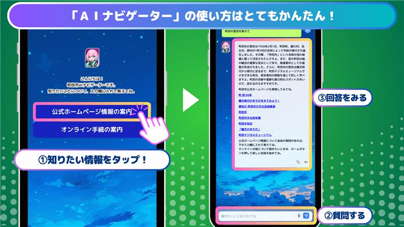 生成AIを活用した「AIナビゲーター」が、チャット形式で、オンライン手続きやホームページの情報をご案内します。