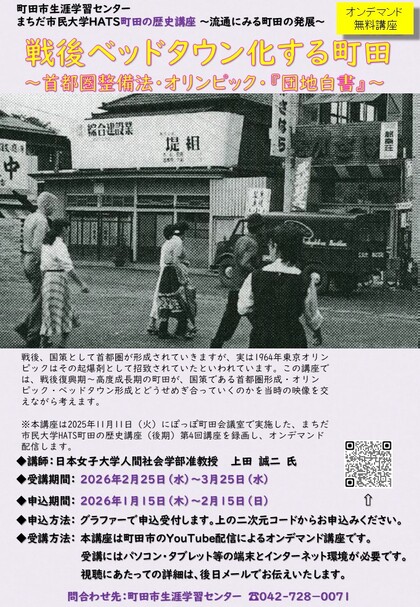 戦後、国策として首都圏が形成されていきますが、実は1964年東京オリンピックはその起爆剤として招致されていたといわれています。この講座では、戦後復興期~高度成長期の町田が、国策である首都圏形成・オリンピック・ベッドタウン形成とどうせめぎ合っていくのかを当時の映像を交えながら考えます。