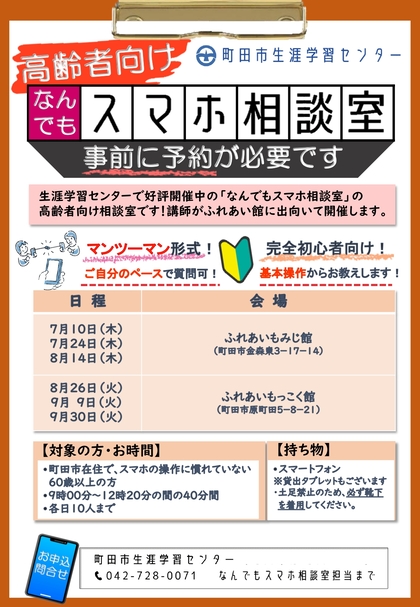 電話:042-728-0071(町田市生涯学習センター) 午前9時~午後5時