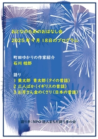 民話や昔話、町田ゆかりの作品を、修練を積んだ「語り手」が味わい深く語ります。文字を離れ耳から入ってくる作品には、ひと味違った感動があります。おはなしの世界にたっぷりとひたれる心地よい時間をお過ごしください。