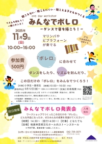 - 申込:ワークショップは事前予約制。Googleフォーム、電話、窓口(ホール1階事務室)いずれかの方法で申込み。当日受付にて支払い。発表会は予約不要。