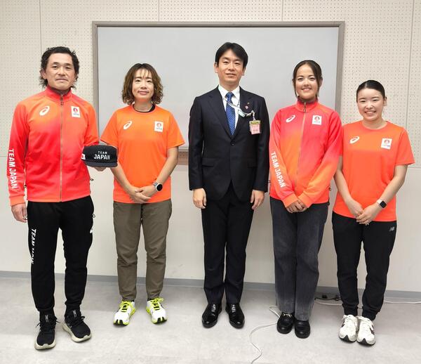 左から山中選手、辻選手、稲垣市長、堀選手、佐藤選手