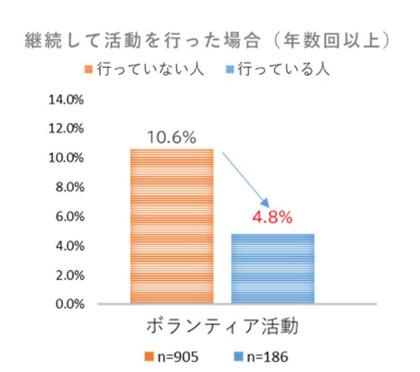 調査を行った社会参加のうち、「ボランティア活動」は、継続して行うことで、フレイルリスクの軽減に効果があることが分かりました。