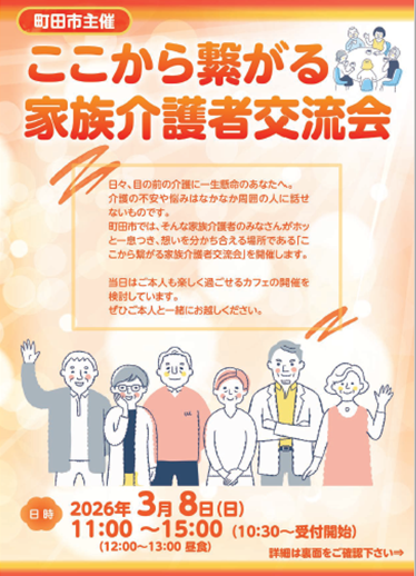 町田市では、そんな家族介護者の皆様がホッと一息つき、想いを分かち合える場所である「ここから繋がる家族介護者交流会」を開催します。