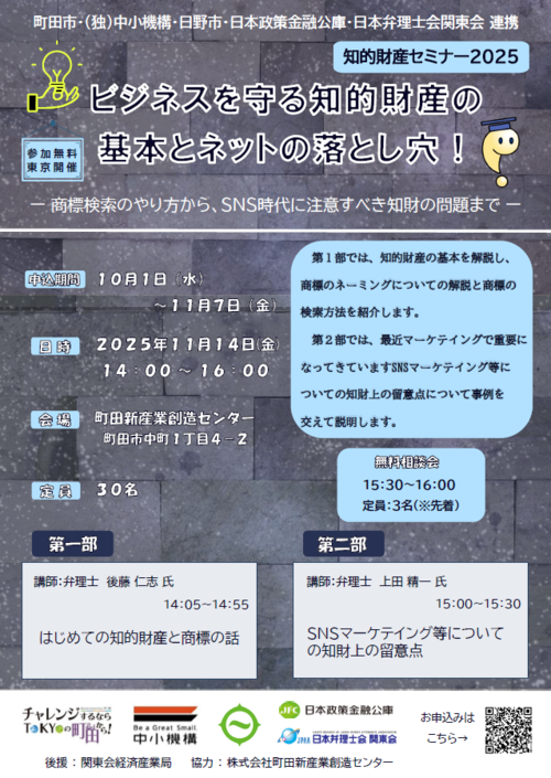 本事業は、町田市、日本弁理士会関東会、日本政策金融公庫、独立行政法人 中小機構関東、日本政策金融公庫、日野市が連携して実施する事業です。