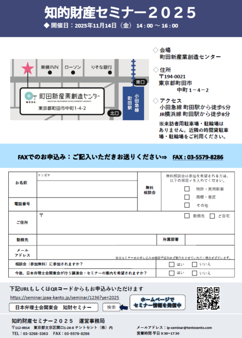 知財セミナー運営事務局申込フォームまらお申込みいただけます。