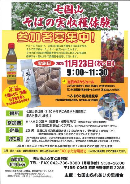 【概要】9月から10月にかけて、七国山の畑には可憐なそばの花が咲き誇り、一面がまるで雪が積もったように真っ白になりました。現在では、その役目を終え、多くの実をつけています。このたび、地元の七国山ふれあいの里組合の指導のもと、そばの実の収穫体験を行います。昔ながらの農機具を使用して、収穫の楽しさを体験していただけます。ぜひ、ご参加ください!