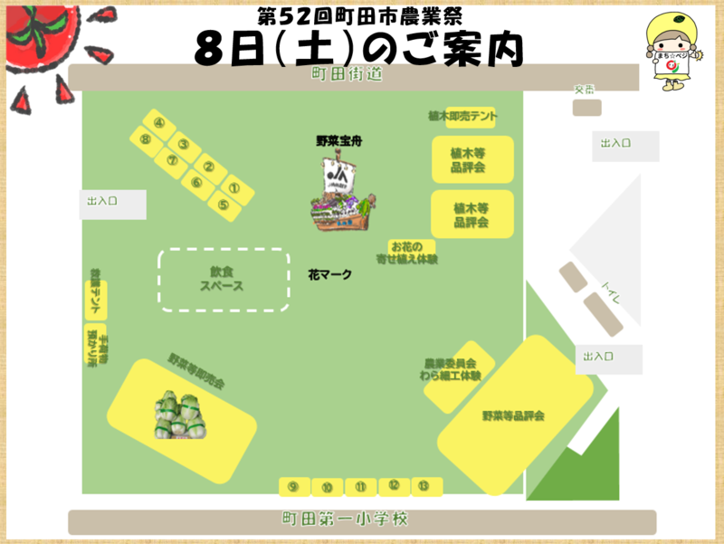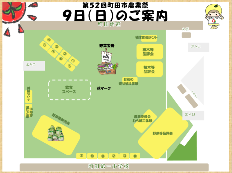 9日の午後2時から野菜品評会テントにて、「野菜宝舟」の野菜は販売し、「まち☆ベジマーク」の花は無料配布します。