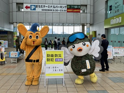 当日は、東京都防犯マスコット「みまもりぃぬ」、東京都出入国在留管理局公式キャラクター「とりぶ」、警視庁シンボルマスコット「ピーポくん」と共に、外国人適正雇用に関するチラシや対策用品の配布を行いました。