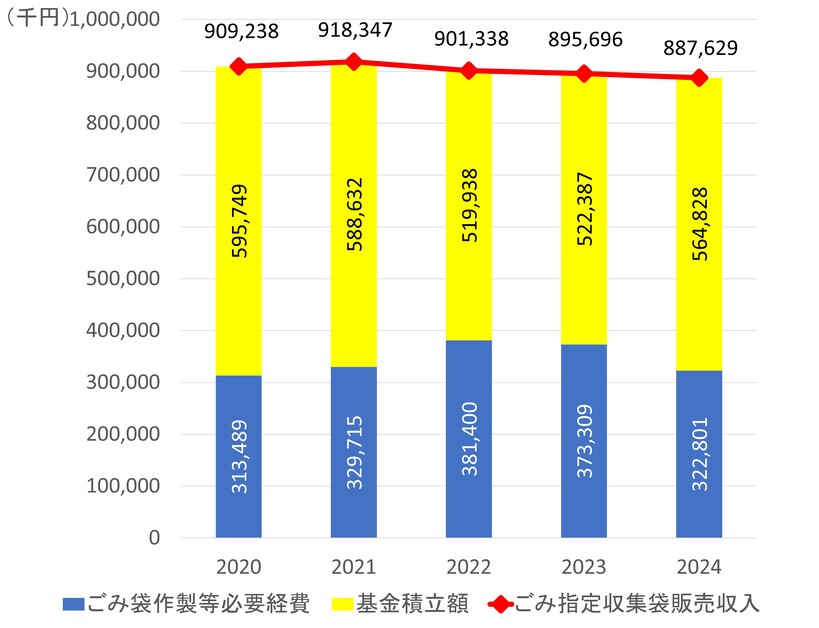 ごみ指定収集袋販売収入額は、2024年度は約8億8千万円でした。
