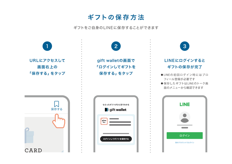 - gift walletの画面が開いたら、「ログインしてギフトを保存する」をおす