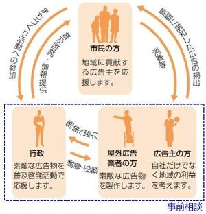 屋外広告物を計画される屋外広告業者や広告主の方に、「事前相談」にご協力いただくことで、多くの人や地域の景観に配慮した屋外広告物が増えていくことを目指しています。