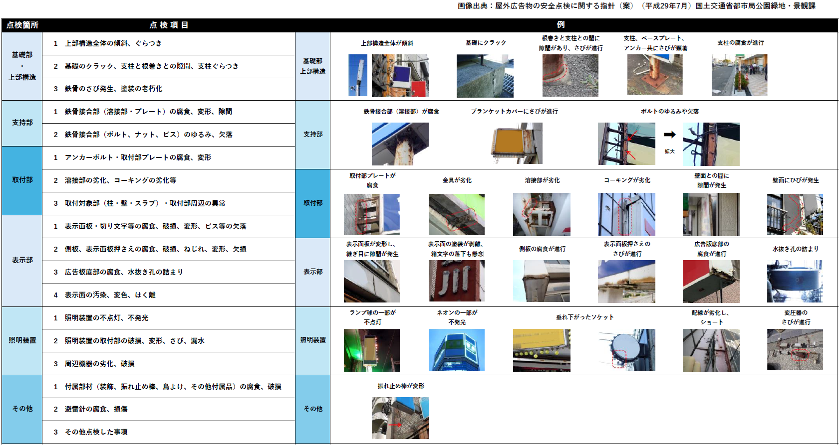 国土交通省が公表している「屋外広告物の安全点検に関する指針(案)」には、屋外広告物の劣化等が起こりやすい場所や、点検箇所・点検項目について詳細に解説されておりますので、ご一読ください。