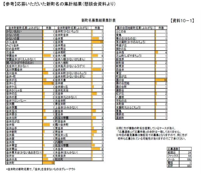 結果:公募結果から、件数上位10個を素案として選出(同率10位が3個あったため12個を選出)し、金井町を区域とする各町内会、自治会および各会員で検討の上、次回懇談会で検討結果を報告する。