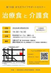 治療食や介護食に関する講演会です。糖尿病や高血圧、腎臓病、嚥下障害等、疾患別の食事に関するお話や料理に不慣れな方向けの簡単レシピ等をご紹介します。