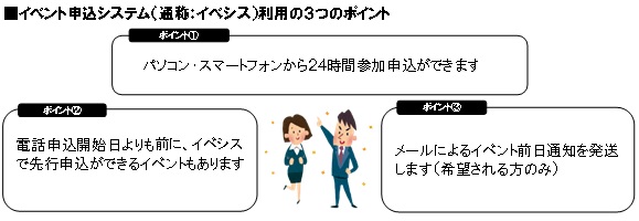 - イベントダイヤルで募集するイベント・講座等は、原則インターネットからも参加申込ができます。今後募集を開始するイベントを調べたり、お申込みいただいた内容の確認や変更、キャンセルが行えます。イベント・講座等の受付初日は原則として正午から受付します。