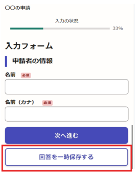 A.ログインして申請し、「回答を一時保存する」を選択してから「次へ進む」と回答の一時保存が行えます。