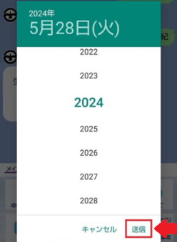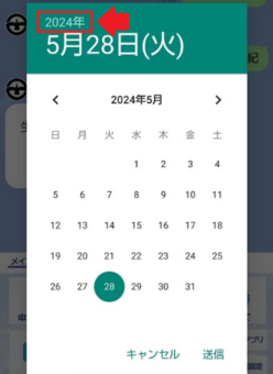 Android端末で日付を入力する際、カレンダーの左上に表示されている「年」の部分(例:2024年)をタップし、年の一覧から直接選択できます。