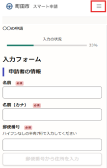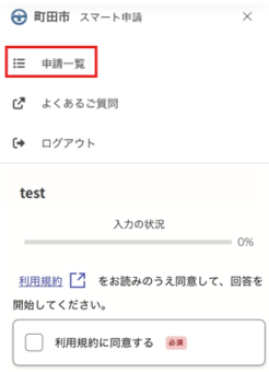申請中でも、画面右上の「メニュー」からいつでもご確認ができます。
