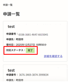 または、申請完了後に送付されるメールの「履歴確認」のURLからも利用可能です。