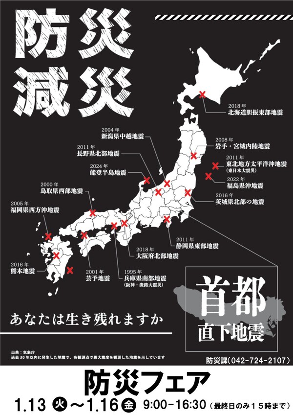 市民への防災知識の普及及び防災意識の向上を図ることを目的とし、毎年2回「防災の日」及び「防災とボランティア週間」に合わせて防災フェアを開催しています。今回の防災フェアでは、発災からの3日間に焦点を当てて家庭における備蓄や在宅避難時における必要物資について紹介します。